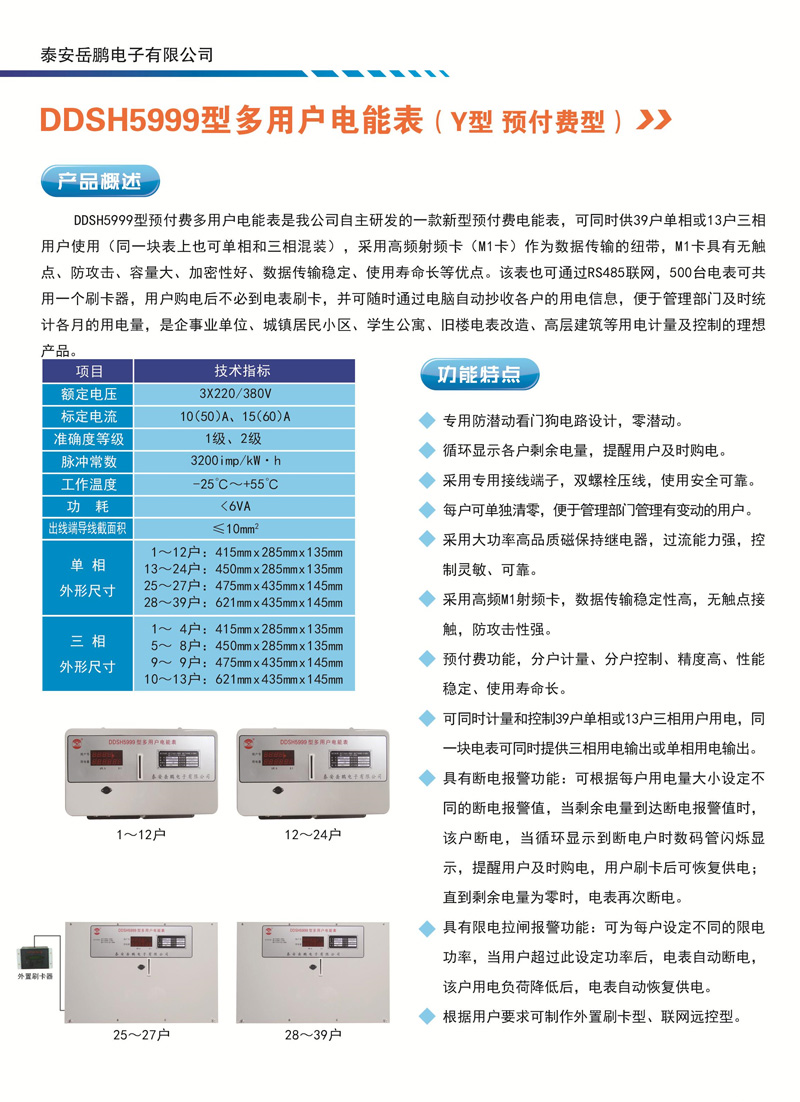 DDSH5999多用戶電能表(預付費型)是我公司自主研發(fā)的一款新型預付費電能表,可同時供39戶單相或13戶三相用戶使用(同一塊表上也可單相和三相混裝),采用高頻射頻卡(M1卡)作為數(shù)據(jù)傳輸?shù)募~帶,M1卡具有無觸點、防攻擊、容量大、加密性好、數(shù)據(jù)傳輸穩(wěn)定、使用壽命長等優(yōu)點。該表也可通過RS485聯(lián)網(wǎng),500臺電表可共用一個刷卡 器,用戶購電后不必到電表刷卡,并可隨時通過電腦自動抄收各戶的用電信息,便于管理部門及時統(tǒng)計各月 的用電量,是企事業(yè)單位、城鎮(zhèn)居民小區(qū)、學生公寓、舊樓電表改造、高層建筑等用電計量及控制的理想產(chǎn)品。