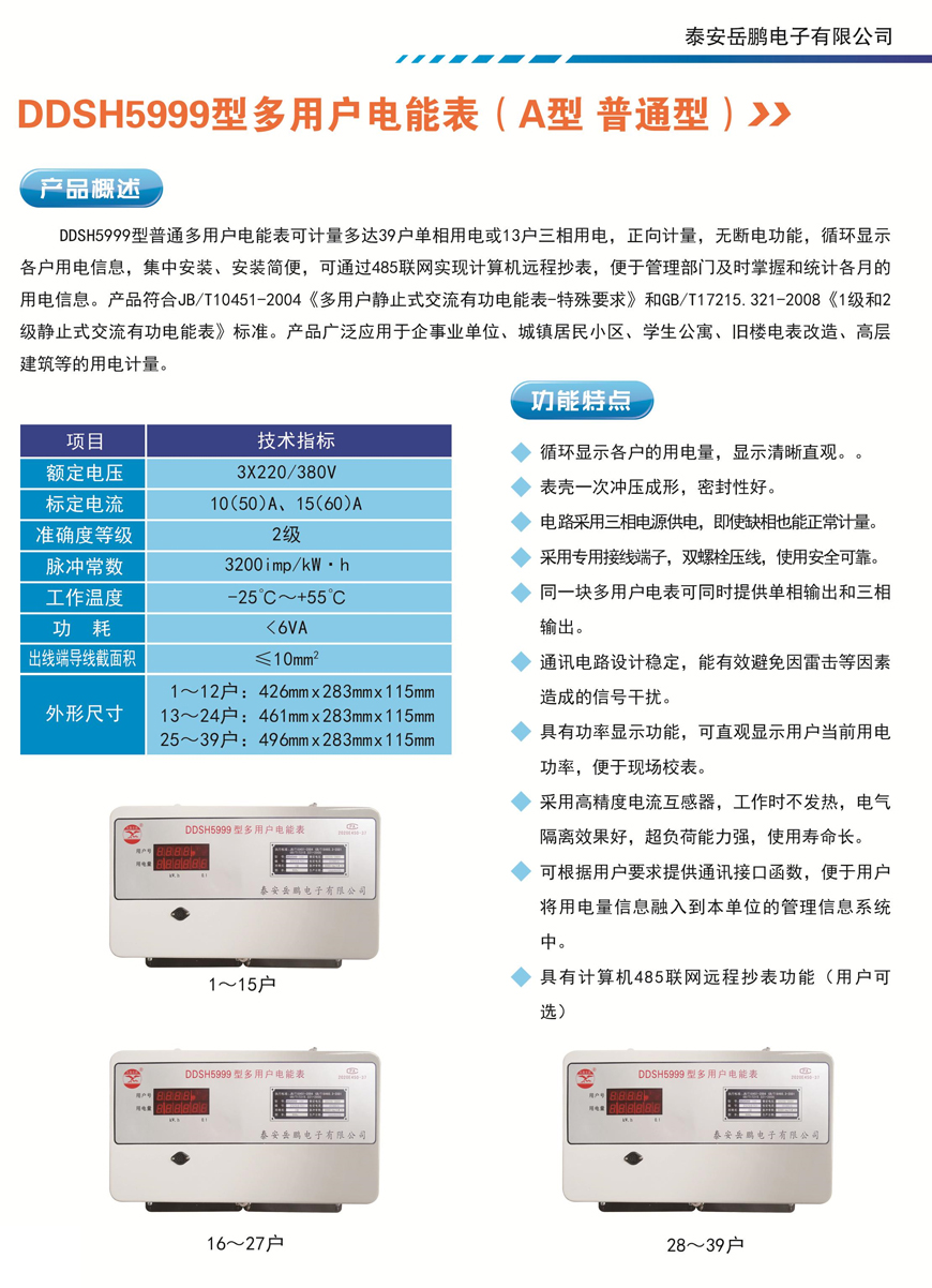 DDSH5999型多用戶電能表是采用微電子技術(shù)和表面焊接工藝生產(chǎn)的智能產(chǎn)品,可計(jì)量多達(dá)39戶單相用電或13戶三相用電,產(chǎn)品采用單片機(jī)處理系統(tǒng)實(shí)現(xiàn)數(shù)據(jù)檢測(cè),分戶計(jì)量與顯示,體積小、抗電磁干擾、功耗低、使用壽命長(zhǎng)、智能抄表等優(yōu)點(diǎn)。該類型電能表正向計(jì)量,無斷電功能,循環(huán)顯示各戶的用電信息,集中安裝、安裝簡(jiǎn)便,主要用于新建樓房、舊樓改造、學(xué)生公寓等用電計(jì)量。該產(chǎn)品符合JB/T10451-2004和GB/T17215.321-2008標(biāo)準(zhǔn)。